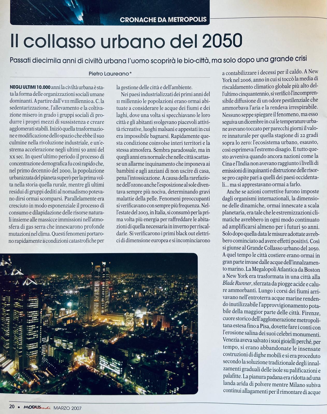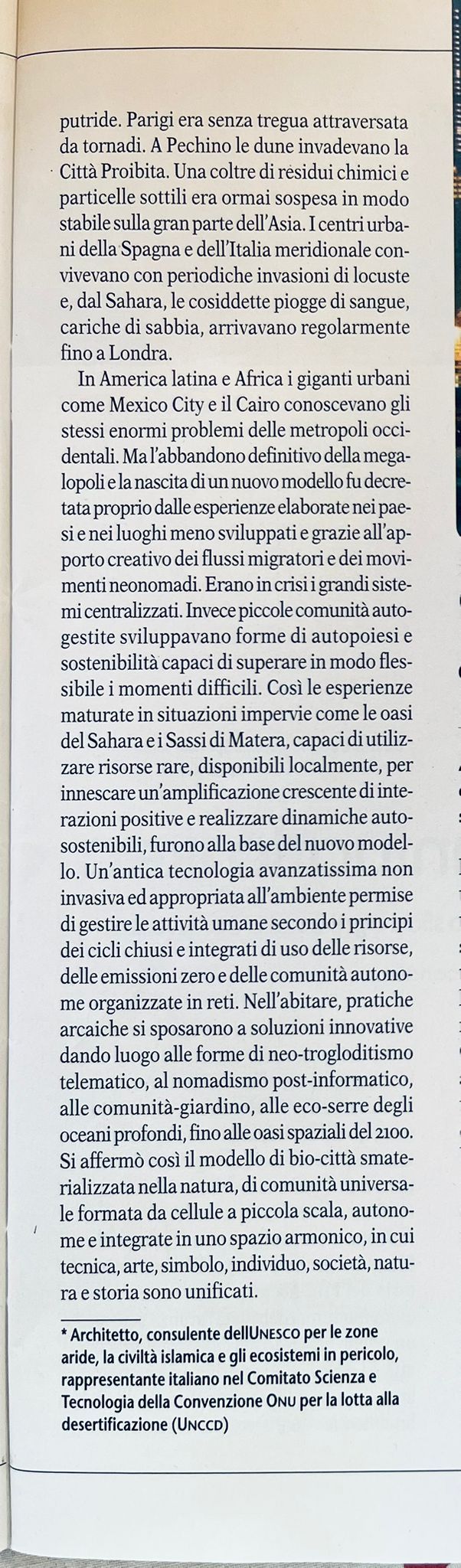 In occasione della Conferenza delle Parti del Panel sul Cambiamento Climatico COP 30 viene ripubblicato questo articolo edito 18 anni fa sulla rivista Modus Vivendi. Dopo lo studio dell’ONU di previsione dello Stato degli Ecosistemi, Millennium Ecosystem Assessment, la rivista ci chiese di fare una previsione della situazione al 2050. Pietro Laureano scrisse questo testo in cui narrava dal punto di vista di un cronista del 2100 . Come si vede purtroppo le catastrofiche previsioni non erano azzardate. Anzi oggi la conclusione sarebbe anche meno ottimistica
