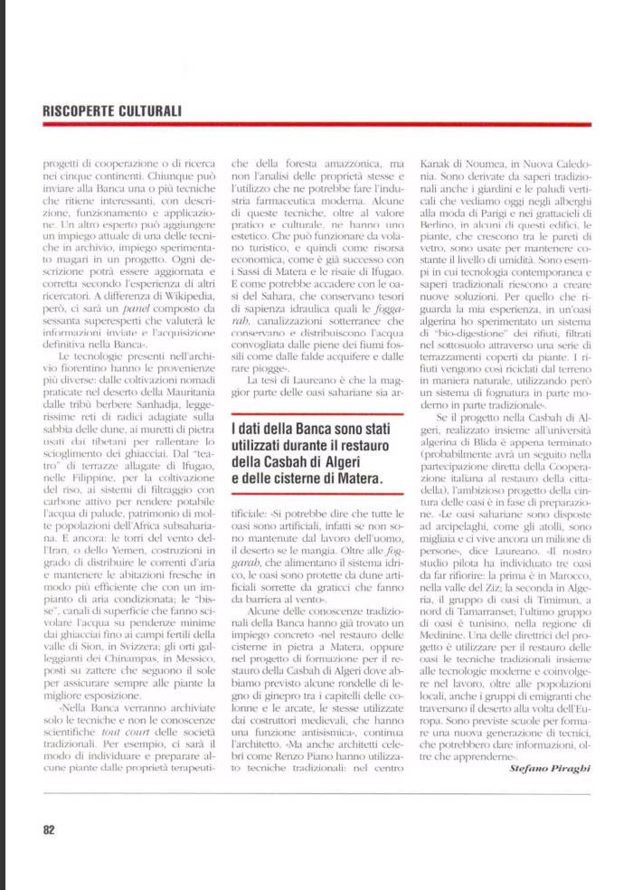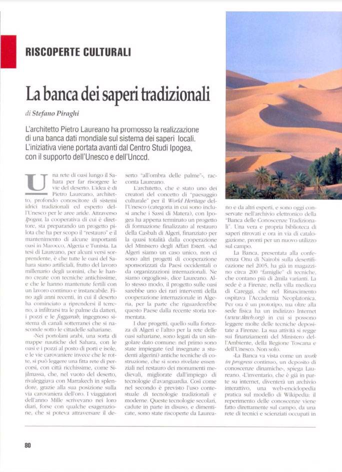 The architect Pietro Laureano has promoted the creation of a world database on the local knowledge system. The initiative is carried out by the Centro Studi Ipogea with the support of Unesco and Uncd.